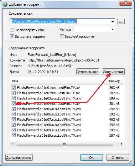 3. Снимаем галочки, и ставим их на те серии, которые хотите скачать