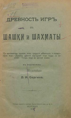 Описание: «Древность игр в шашки и шахматы» — монография Давыда Ивановича Саргина, русского историка шахмат и шашек, посвящённая истории развития более 30 вариантов игры в шашки, шахматы (нарды, столбовые шашки, поддавки и т. д.), проникновении их в Европу и Россию. Исследование вышло в Москве в 1916 году и не переиздавалось.